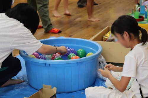 会場には、定番のヨーヨーすくいやストラックアウト、少し珍しいプラバン作りコーナーなどが設置されていました。みんな景品欲しさに真剣です。