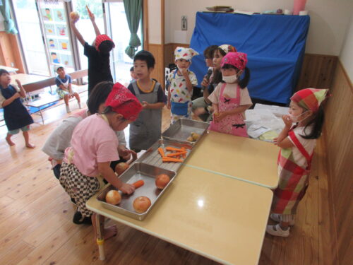 それぞれのお部屋に帰って、にんじんやジャガイモの皮をピーラーで剥いたり、玉ねぎの皮を手で剥いたり、先生と一緒に切っています。お部屋の中にいると、玉ねぎが目に染みて涙が出てきちゃいますねぇ~。