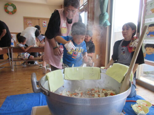 野菜を切った後には、再び遊戯室に戻ります。先生がダイナミックにお肉を炒めると、お部屋中にいい香りが漂います。大きなお鍋に切った野菜を入れてくれたのは、年中のお友だち。やけどしないようにしっかり手元とお鍋の中を見て~気を付けて~!