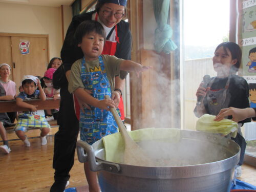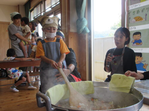 年長のお友だちは、お鍋の中にたっぷり入った野菜を、大きなしゃもじで炒めてくれる係です。両手でしっかり持って力を入れないと、上手に炒められないよ~~!思わず、しゃもじを握る手にも力が入りますね。