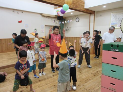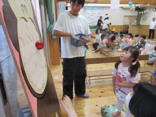 夕飯のあとは、遊戯室でお楽しみ会です。会場には、カラフルな提灯が飾り付けられて、夏祭りに来た気分で気持ちも高まります。