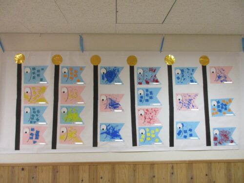 園舎では、年長さんが製作で作ったこいのぼりたちが、壁一面にゆうゆうと泳いでいます。風に吹かれて泳ぐこいのぼりたちが素敵ですね🎏