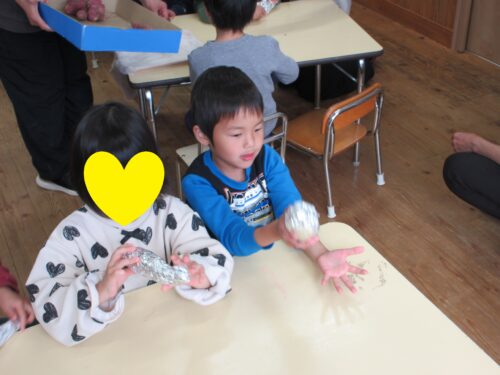 年長活動でまずは今日のお話と、焼くためのお芋をキッチンペーパー、アルミホイルにみんなで包みました