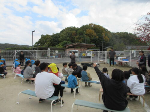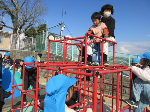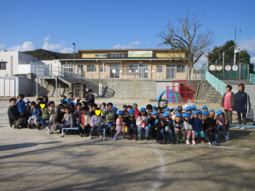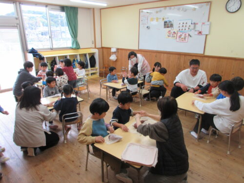包んで、さぁ外に出ようかというタイミングで、ふたば保育所のお友だちもやって来ました