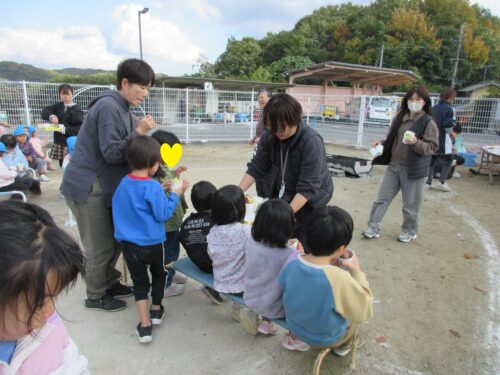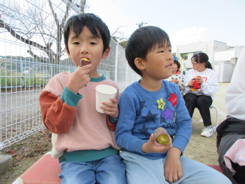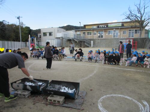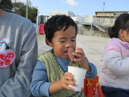 「焼けたよー!」のかけ声にみんな再び椅子に集まりました。焼き芋のなんとも食欲をそそる香ばしい匂いが漂ってきて、待ちきれない様子の子どもたちでしたよ