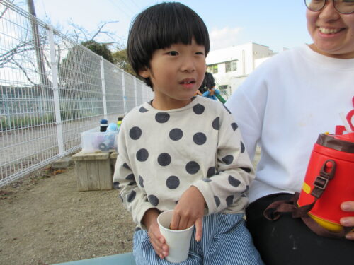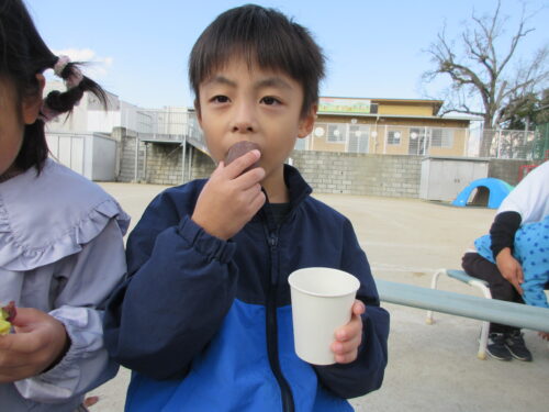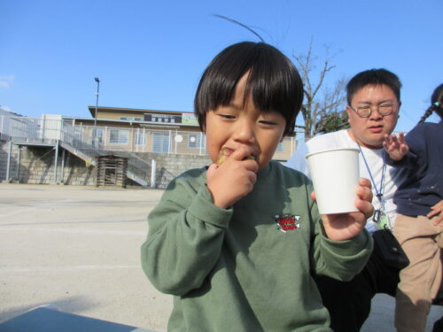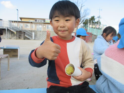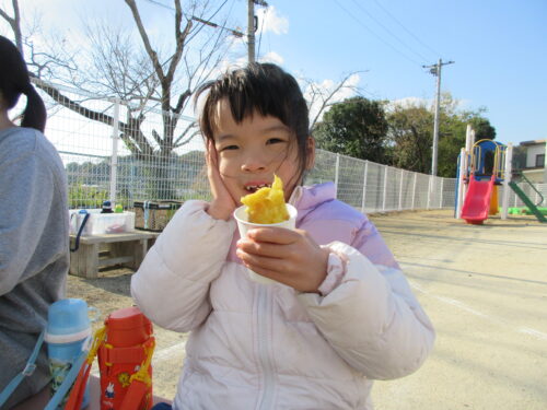 紙コップに入ったお芋を配ってもらい、みんなで「いただきます!!」をして食べました