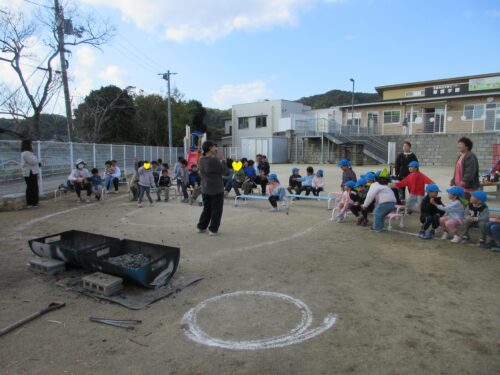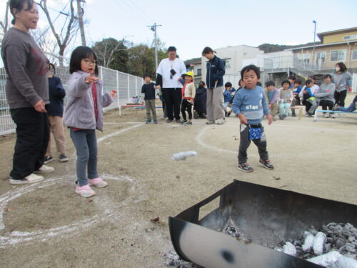 昨日メールやブログでお伝えしたように、今日は草笛の年長児さんと、ふたば保育所の年長児さんとで、やきいも会を行いました