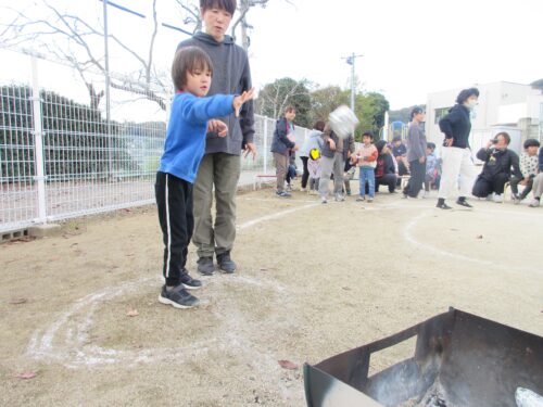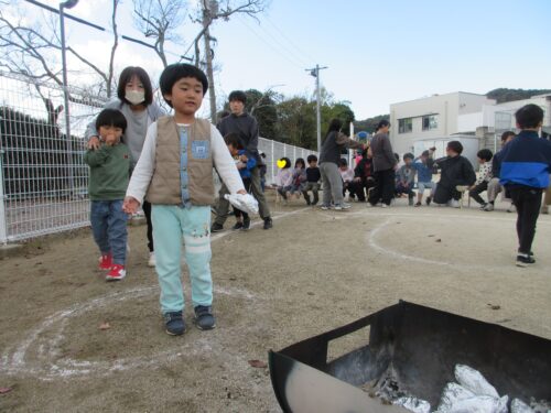 今日のお話をして、順番に包んだお芋を火の中へ投げ入れていきます
