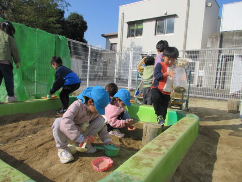 ふたば保育所のお友だちと乗り物の貸し借りをしたり、お店屋さんを開いて友だちに振る舞ったりと、