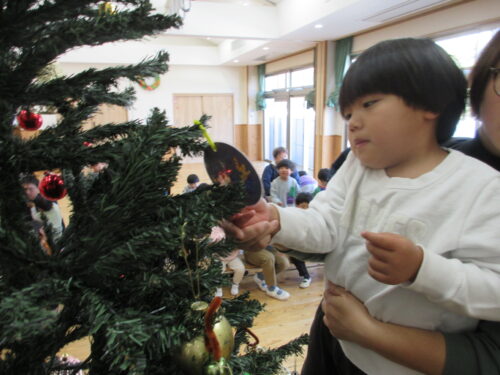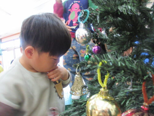 数日前から玄関に飾りのついていないツリーを置いていました。不思議そうに見ている子、ツリーを触ってる子、「ナンニモ、ナイネ」という子、自分の帽子を吊り下げている子もいました。ほんとに感じ方はいろいろです。
