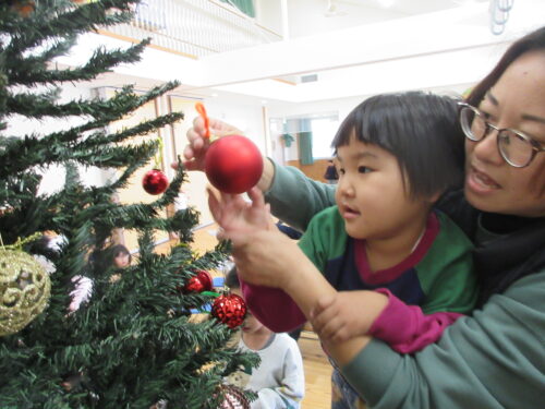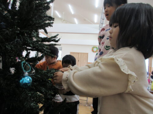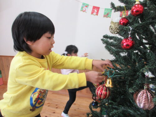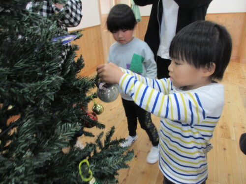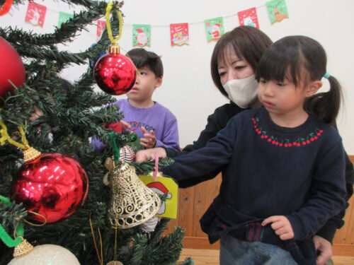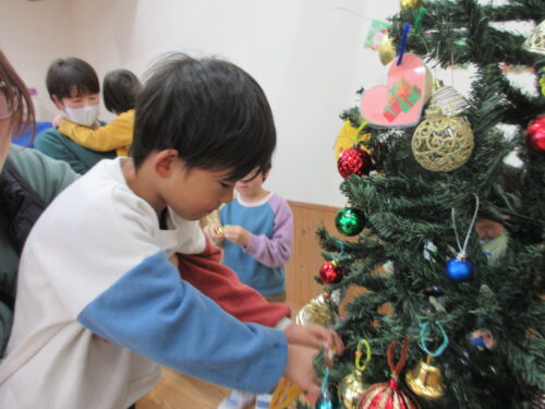 最後は、れんげぐみ。早くやりたい気持ちがありながらも、自分たちの出番を待っていました。ツリーの下の方はもう飾りがついているので、高い所に飾りをつけるように願いをしました。好きなオーナメントを選んで、台の上にあがり飾りをつける子どもたち、だんだんとツリーが素敵になっていく様子も感じながら楽しんでいましたよ。