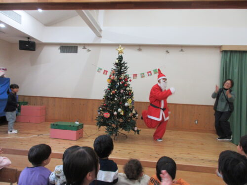 ライトがピカピカ点灯すると、どの子もくぎ付け。そんな中、なんと、あわてんぼうのサンタクロースがやってきたのです!!!サンタの登場にびっくりしている子、喜んでいる子、プレゼントを期待している子、握手をする子、不思議そうにそばまでいってまじまじと見ている子。いろんな反応がありましたよ。