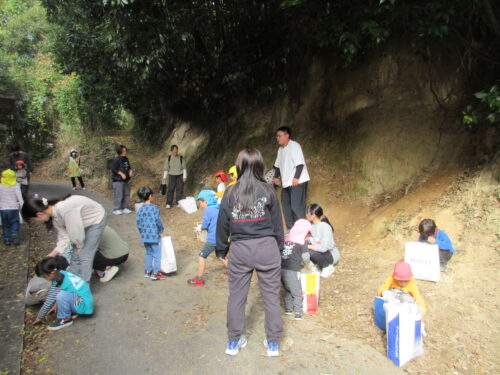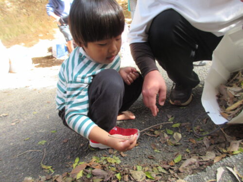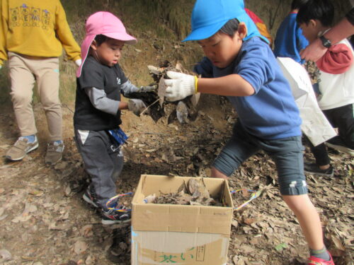 年長活動のお集まりで「ふたば保育所のお友だちも呼んで、やきいもするよ!だから、焼くために必要な葉っぱを集めよう!」とみんなで落ち葉拾いに出かけました