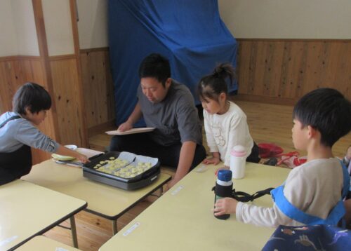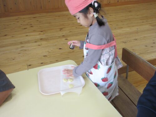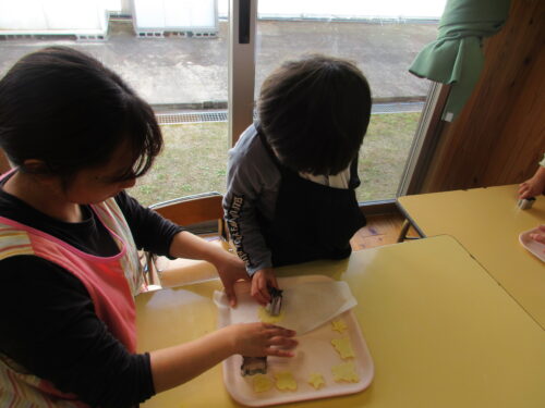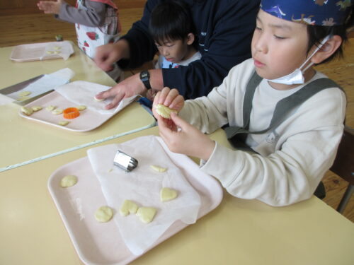 2回目は、ハートや星などの型抜きを使いました。平らにした生地の上に型を置き、手でギューと力を入れて、そっと生地を抜きます。する工程によって力の入れ具合も変えないと上手くいきません。そうやって、経験をしながら力の調整をしている子どもたち。一つ目は上手くいかなくても、2個目、3個目とだんだんとコツをつかんでいましたよ。上手くできると嬉しそうな表情を見せていました。