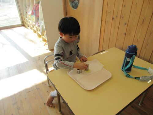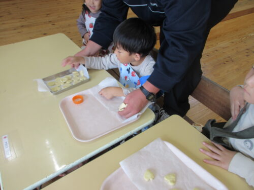 生地はみんなで作ります。ナイロン袋の中に、粉、水、マーガリン、砂糖を入れてこねます。子どもたちは、順番にこね、粉がまとまっていく様子を見て「ワー」と言って変化を感じたり、友だちがこねている様子見て、“ボクも、私も、早くしたい”とアピールしたりしていました。