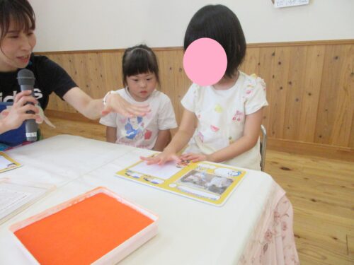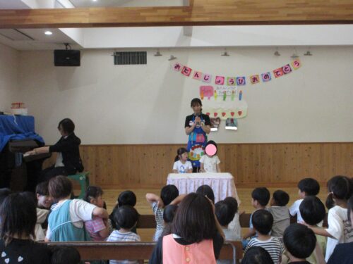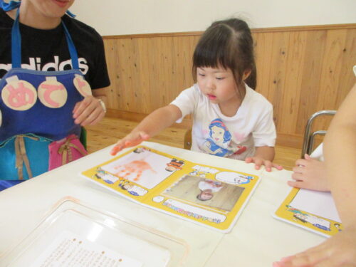 第2部は、『おやつたーべよ』と言うペープサートと、『ねこのピート だいすきなよっつのボタン』と言う音つき絵本をみんなで見ました