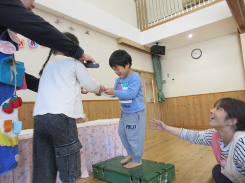 その後は、りんご・みかんなどに見立てた、ボールをあおむしにめがけていっぱい食べさせてあげました!