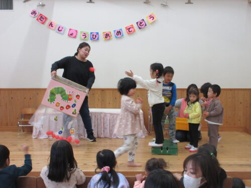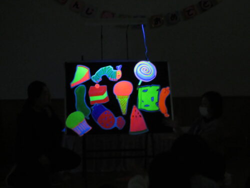 ドキドキする子もいましたが、始まると、暗闇の中に綺麗に輝く『はらぺこあおむし』にみんな釘付けです。