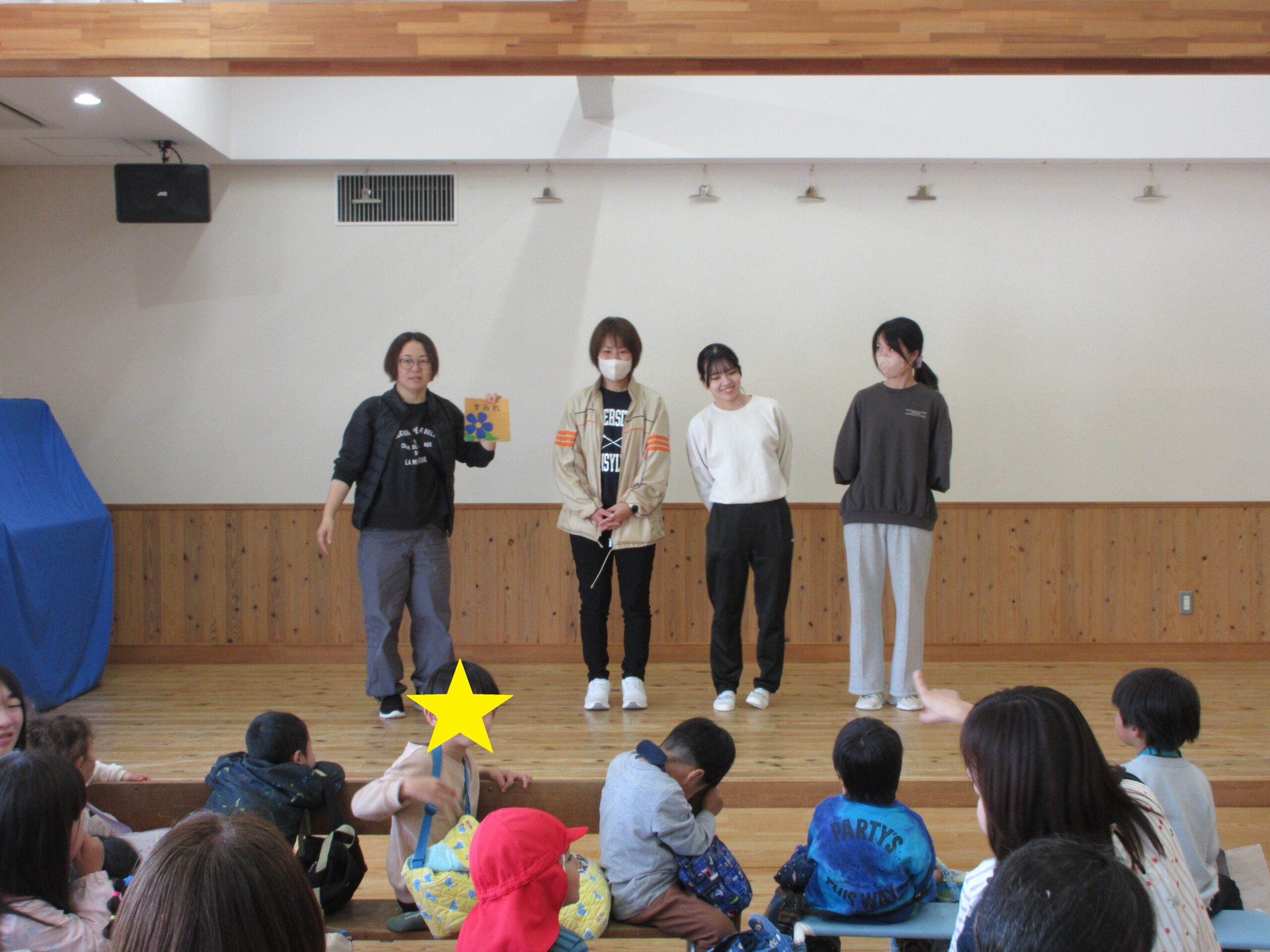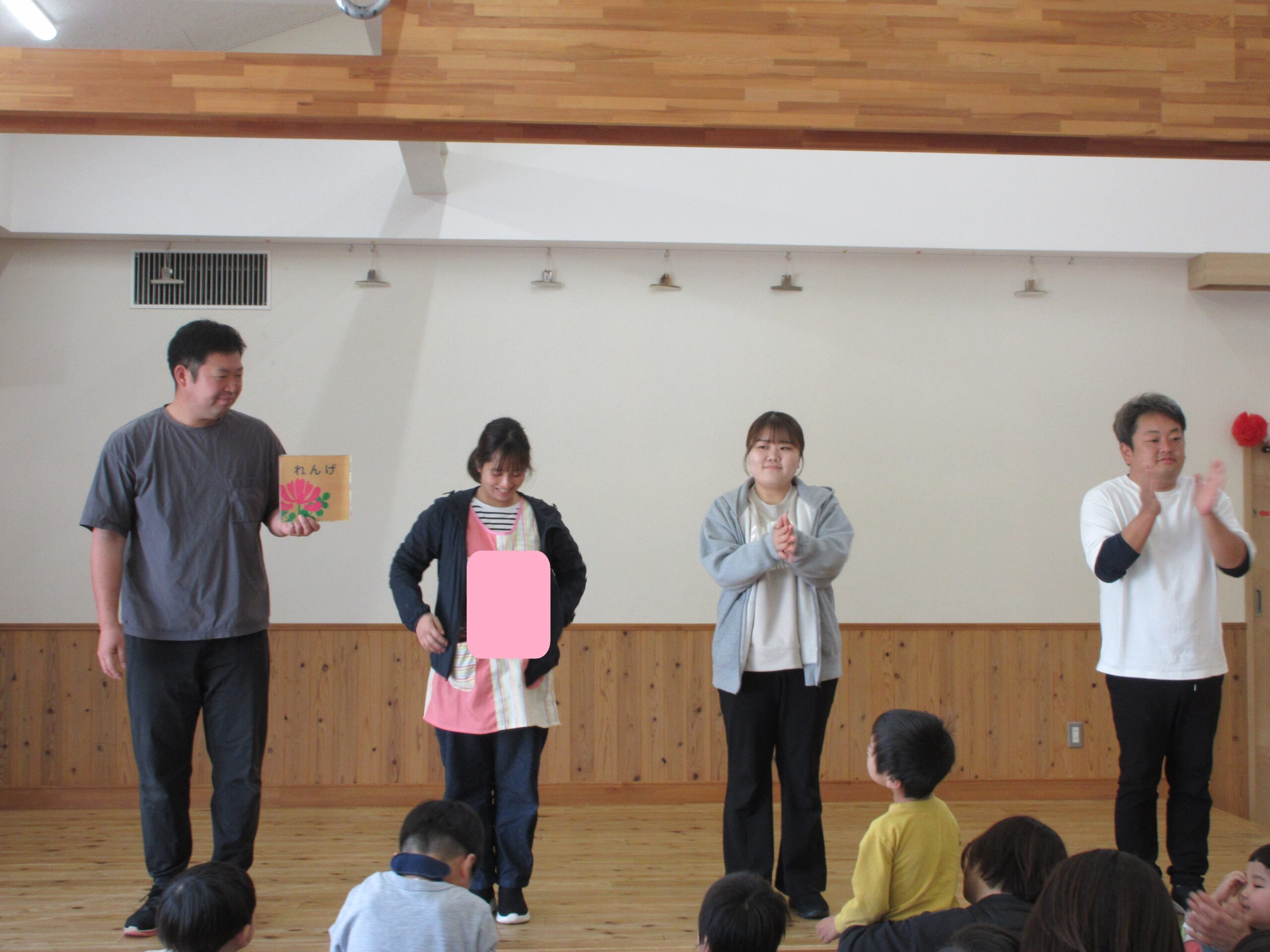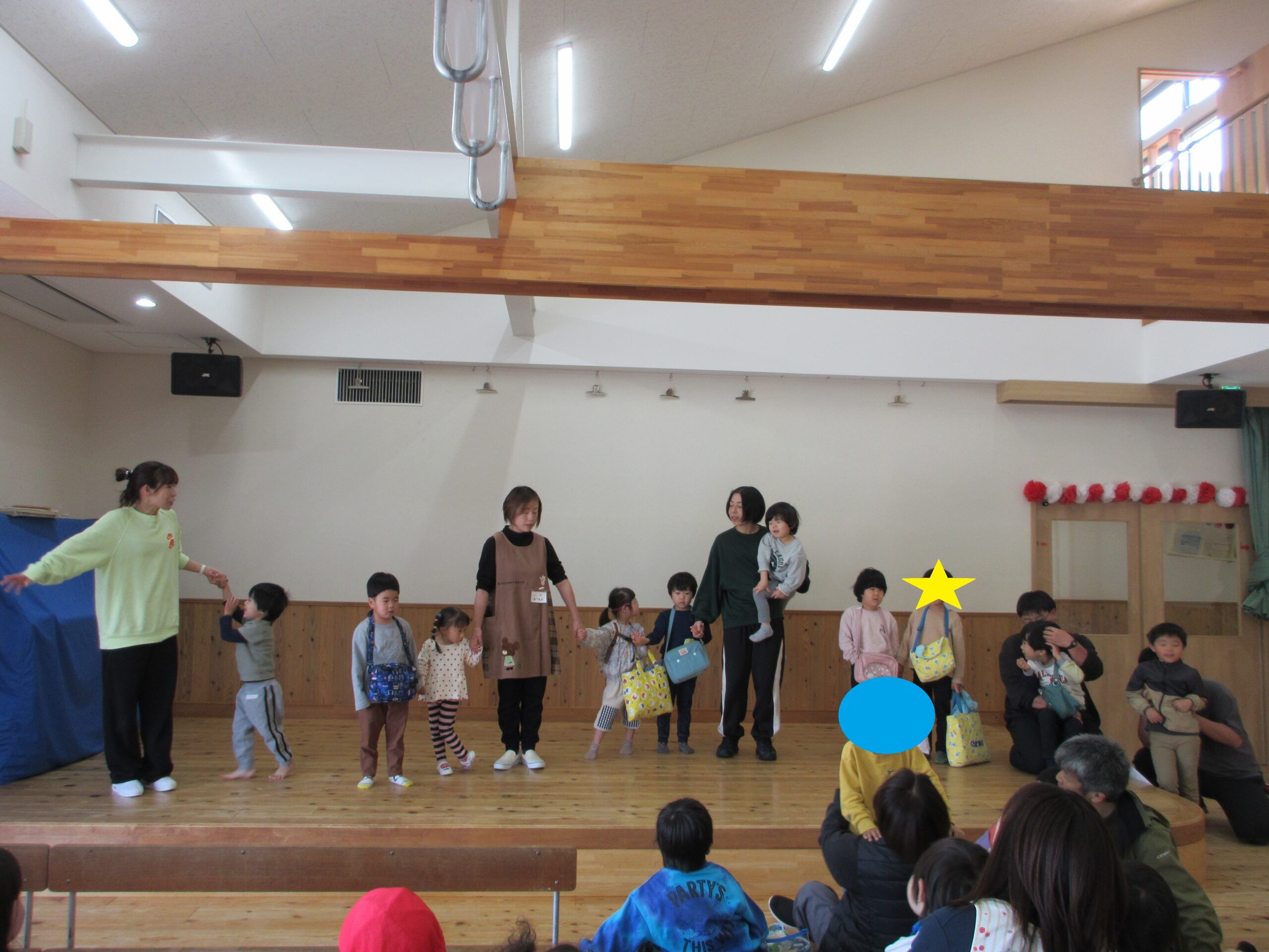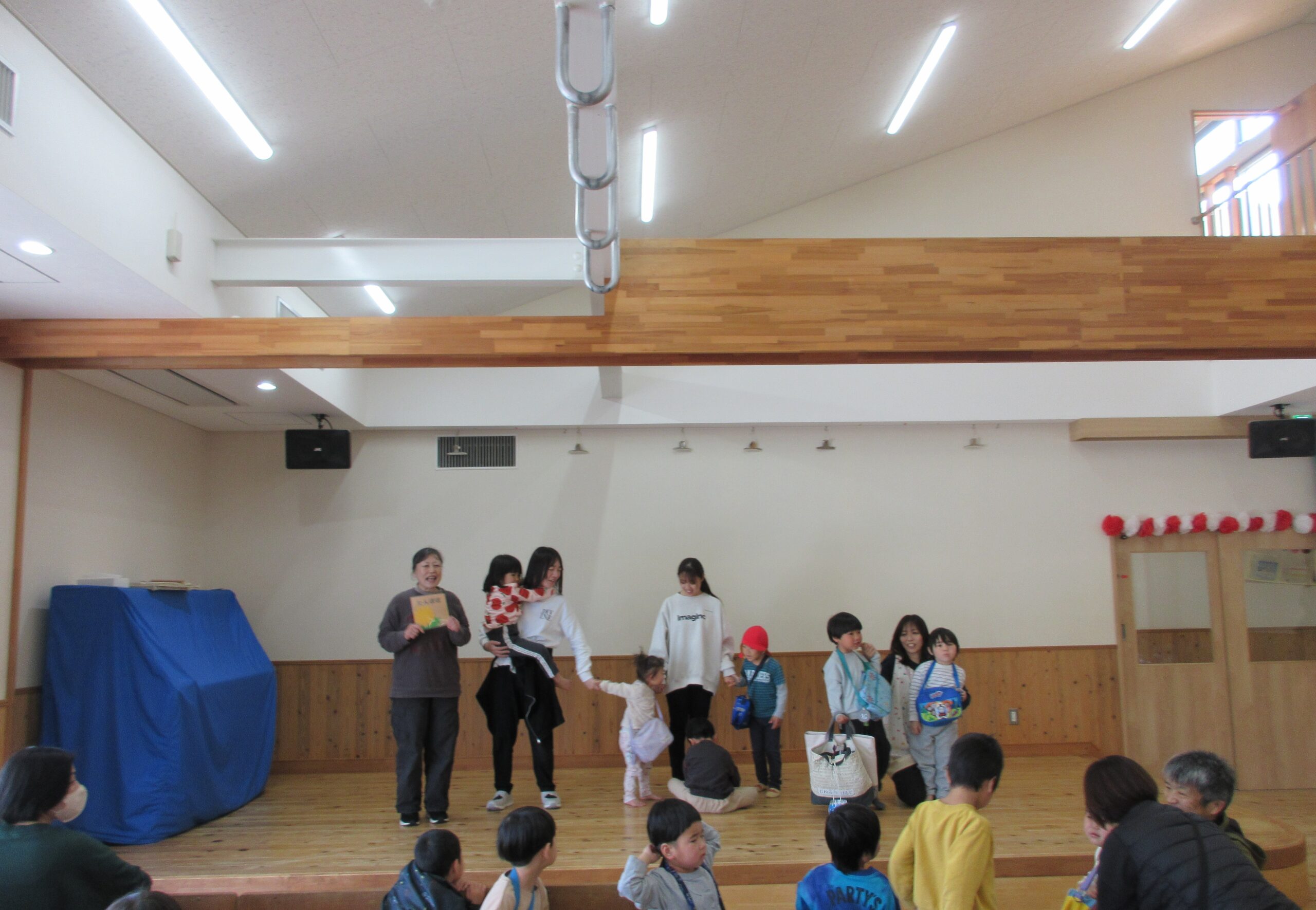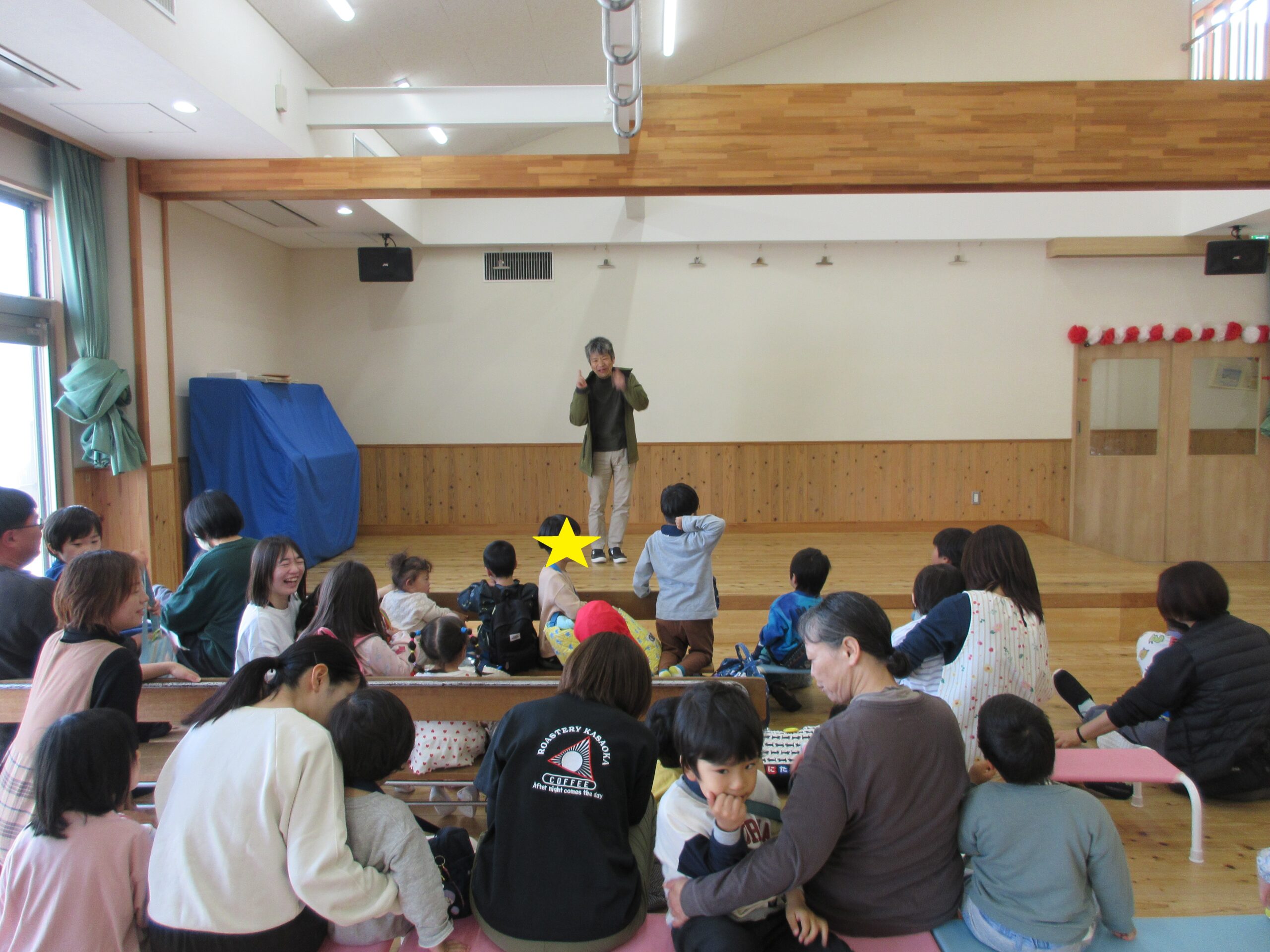 登園してきたお友だちは、楽しそうな絵本のおはなしに誘われて遊戯室へ。始業式が始まります。大好きな『おめんです』を見ながら、ちょっぴり風通しがいい背付き椅子に座っています。園長先生のお話にもしっかり耳を傾けていますね。