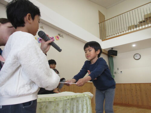 2部では、『しあわせならてをたたこう』をみんなで歌いました。それから、卒園式で歌う『にじ』を年長さんが歌ってくれました。