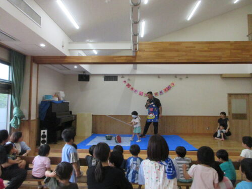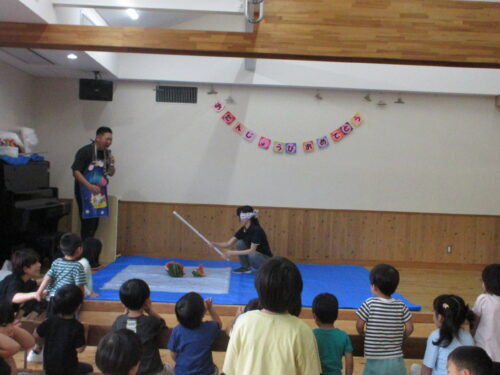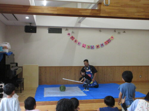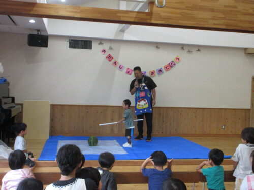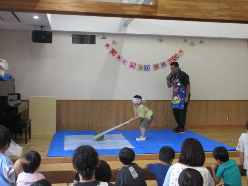 まずは、手作りスイカをみんなで順番に割って遊びました。目隠しをしながら「前に~ 前に~」とスイカの位置を知らせていき、みんなで楽しくスイカ割りを楽しみました☆
