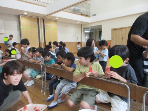 みんなで、楽しく・美味しくスイカを食べて子どもたちも「オイシイ!」「ア~、楽シカッタ!」「モウ一回」と大盛り上がりでした。